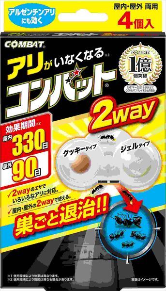 クッキータイプとジェルタイプ、2種類のエサで色々なアリに対応するアリ用ベイト剤。屋内でも屋外でも使える。効果は屋内で約330日、屋外で約90日。4個入。