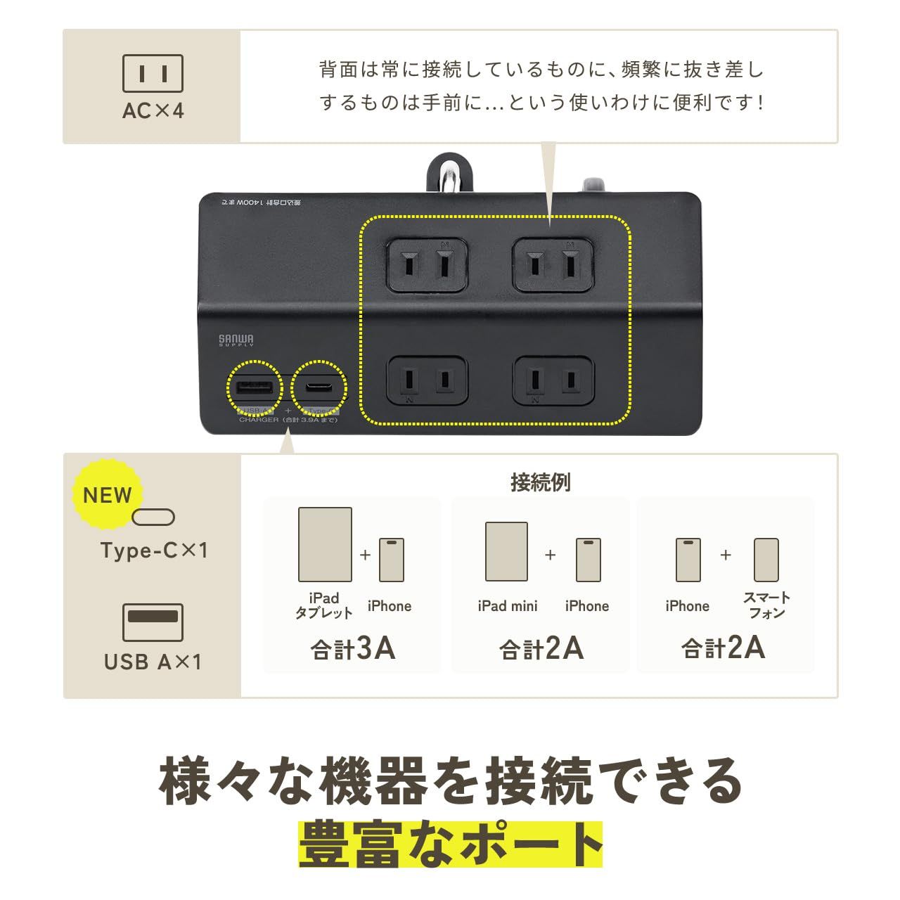 サンワダイレクト 卓上電源タップ クランプ 固定式 AC 口 USB-C×1 USB-A×1 3 m 一括集中スイッチ 卓上 固定 電源タップ ブラック 700- -3 BK