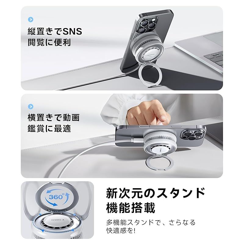 TORRAS ワイヤレス充電器 冷却ファン付き マグセーフ充電器 QI2対応 ペルティエ素子 15w出力 1.5mケーブル付き 360°回転式スタンド コンパクトサイズ 30W以上の出力対応単ポートアダプターが必要