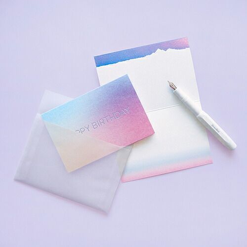 オーロラを思わせる美しいホログラムの箔押しが人気の「NORDLYS」にグリーティングカードが登場です。「HAPPYBIRTHDAY」の文字とカード中面の空にホログラム箔を使っているので、カードを開く動きで光の変化を楽しむことができます。夕暮れから夜明けまでの空をイメージしたグラデーションは、それぞれに時間帯を表すタイトルがつけられています。付属のトレペ封筒に入れると淡く透けてカーテン越しの空のように見えます。【検索ハッシュタグ】#エルコミューン#ノールリス#グリーティングカード#真夜中