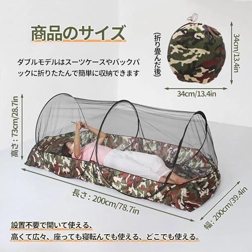 ※広い空間、2人用蚊帳※蚊帳のサイズ:長さは200cm、幅さは120cm、高さは73cm。身長180cm、体重80kgの男性が仰向けに寝ても活動スペースが余裕があります。2人用のモスキートネットです。
