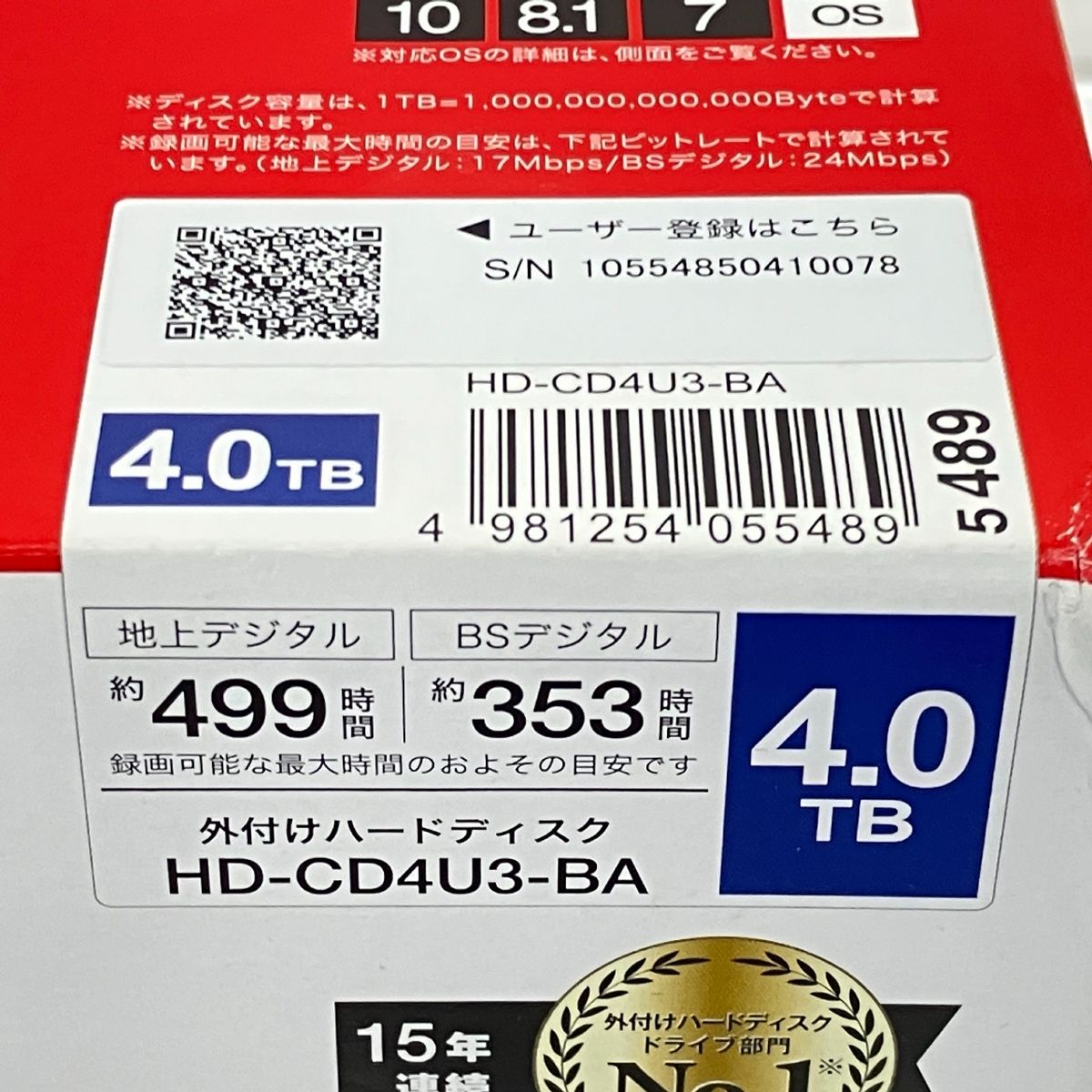 BUFFALO製、大容量4TBの外付けハードディスク「HD-CD4U3-BA」です。