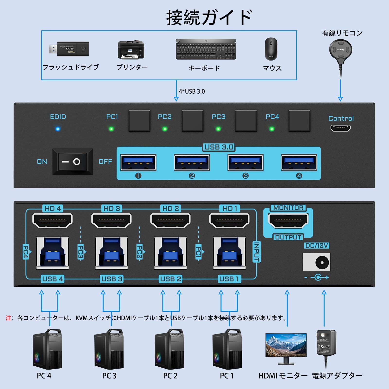 ANXQQ 8 K KVMスイッチ HDMI 4 台のコンピューターが 1 つのディスプレイ 切替器を共有 EDID 機能をサポート つの USB 3.0 ポートを備えた KVM Switch 有線リモコンと電源アダプターが付属