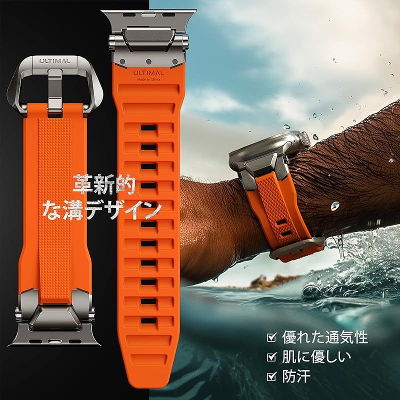 スポーツの相棒 - 男性向けに設計されたULTIMAL Apple Watchバンドは、高品質デザインで耐久性と通気性を両立。バンド底部の排水溝とダブルカーブ金属コネクターが通気性と柔軟性を向上。