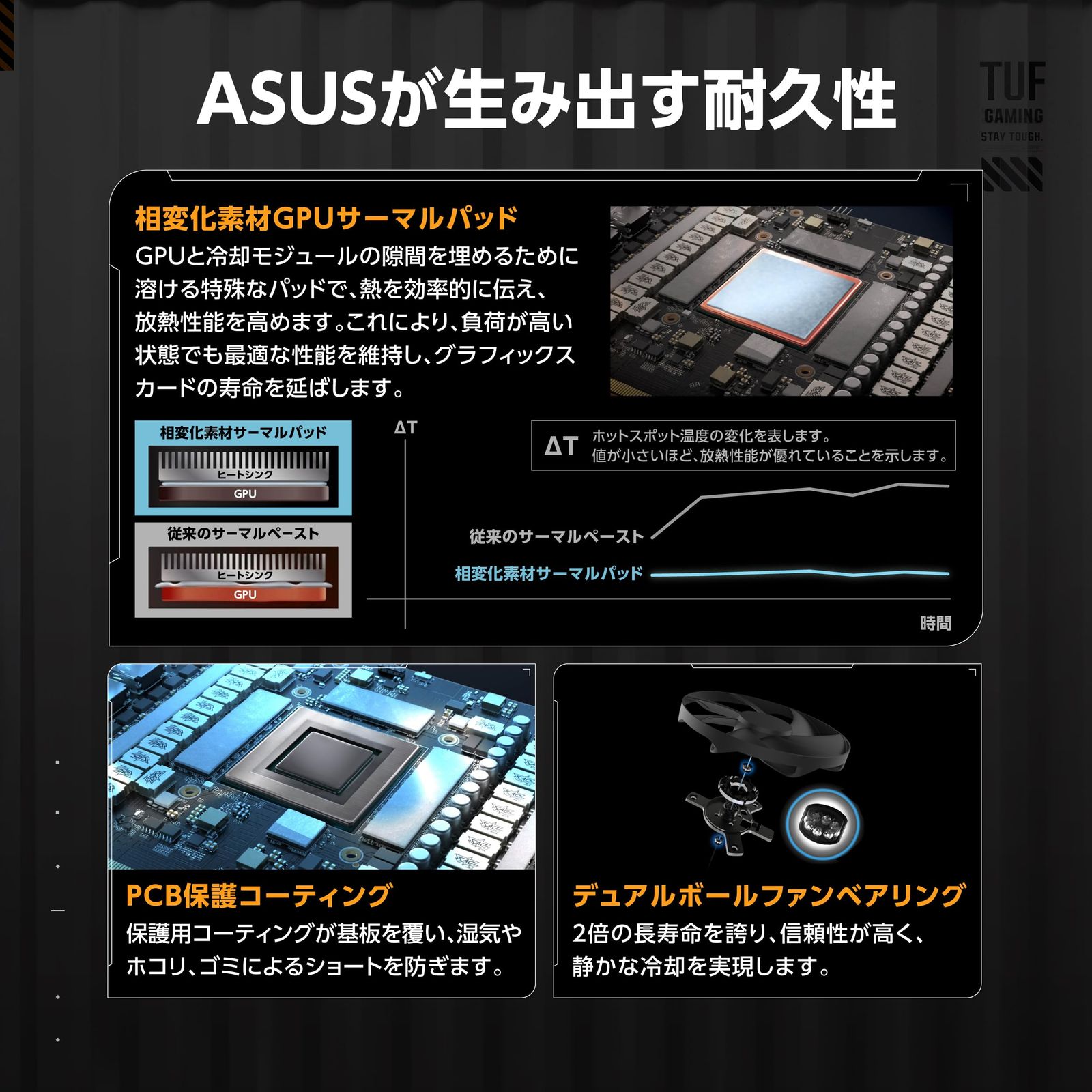 MaxContactデザイン:ASUS独自の製造プロセスで、GPUのヒートスプレッダの表面積を5%拡大。強力なヒートシンクとAxial-techファンと組み合わせることで、最大2°Cの温度改善を実現。フェーズチェンジGPUサーマルパッド:GPUとサーマルモジュールの隙間を溶けて埋めることで、優れた熱伝導性と熱放散を実現し、重負荷時でもグラフィックスカードの最適な性能と長寿命を確保。Axial-techアップグレード:Axial-techファンはデュアルボールベアリングを採用し、標準ファンより最大23%多くの風を供給。新しいファンの回転方式:外側の2つのファンは反時計回りで回転し、乱流を減少。GPU温度が50°C未満で停止、55°C以上で再起動し、性能と静音を両立。通気性のあるエクソスケルトン:高品質なダイカストシャウドとアルミ製バックプレートがPCBの曲がりを防ぎ、大型のベントで熱放散をさらに強化