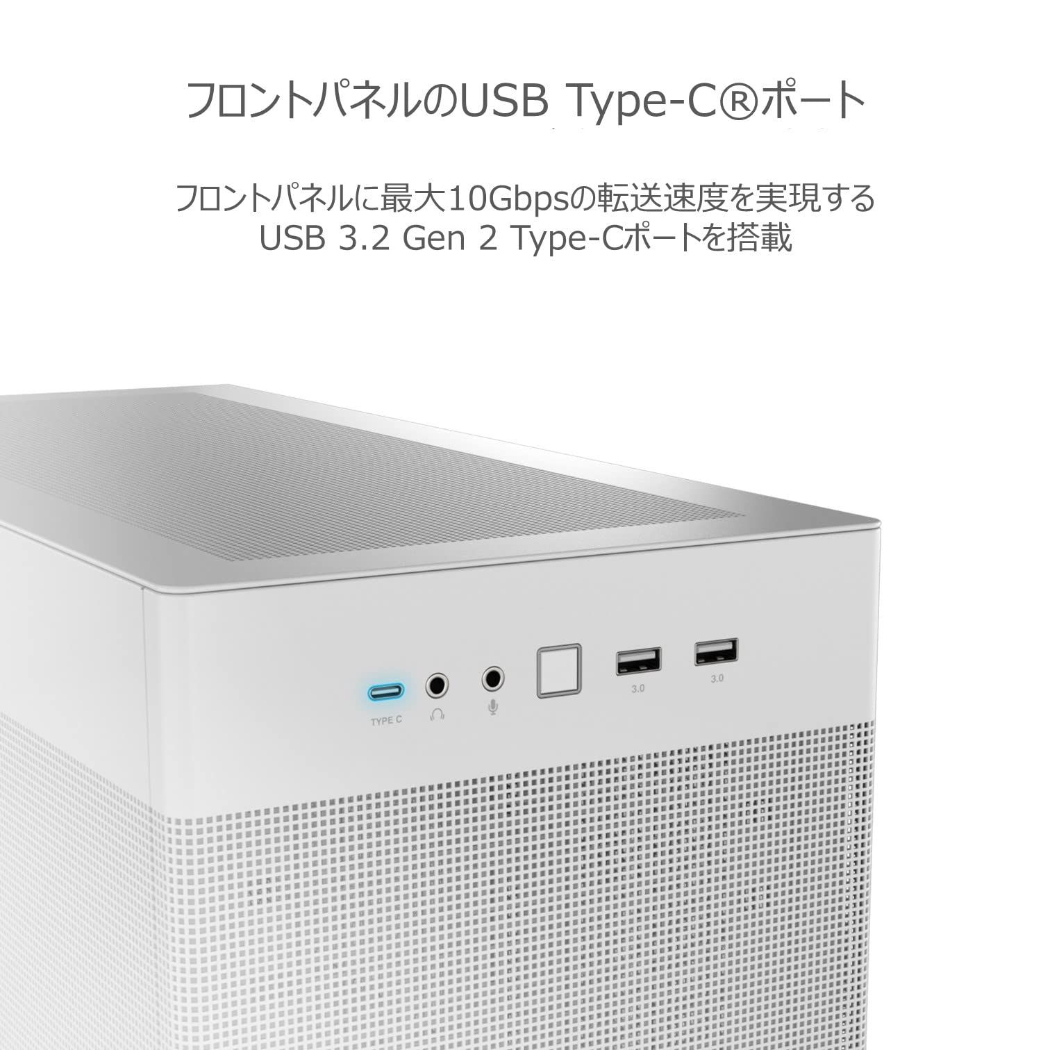 フロントI/Oポート : 1xヘッドフォン、1xマイク、1 x USB 3.2 Gen2 Type C