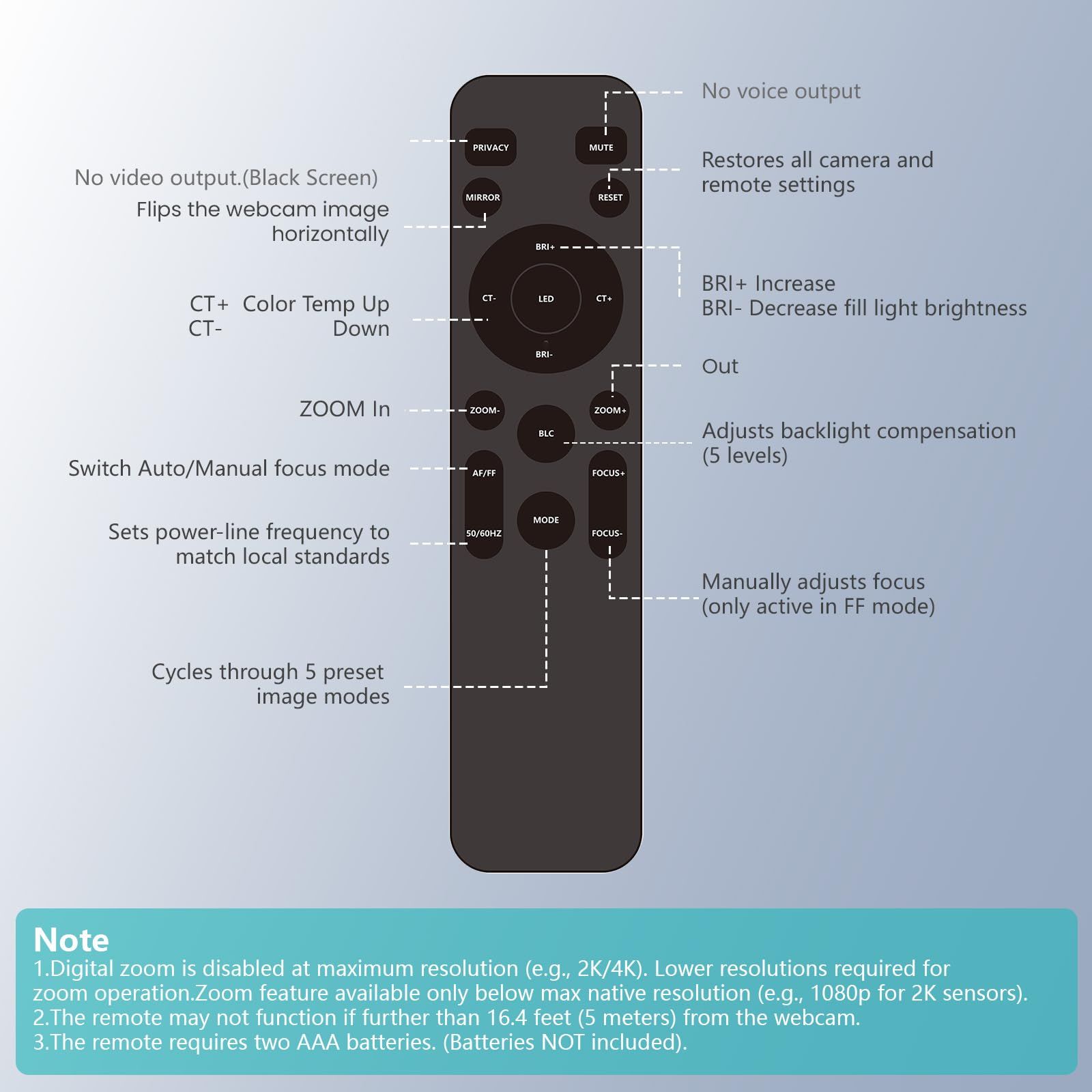 【リモコン操作で多機能コントロール】付属リモコン(電池別売)で明度・彩度・コントラストを自由に調整可能。固定/自動フォーカス切替、ミラー効果、カメラやマイクのオン/オフも操作できます。さらに3段階ズームイン機能付きで、映したくない範囲を避けて表示できます。