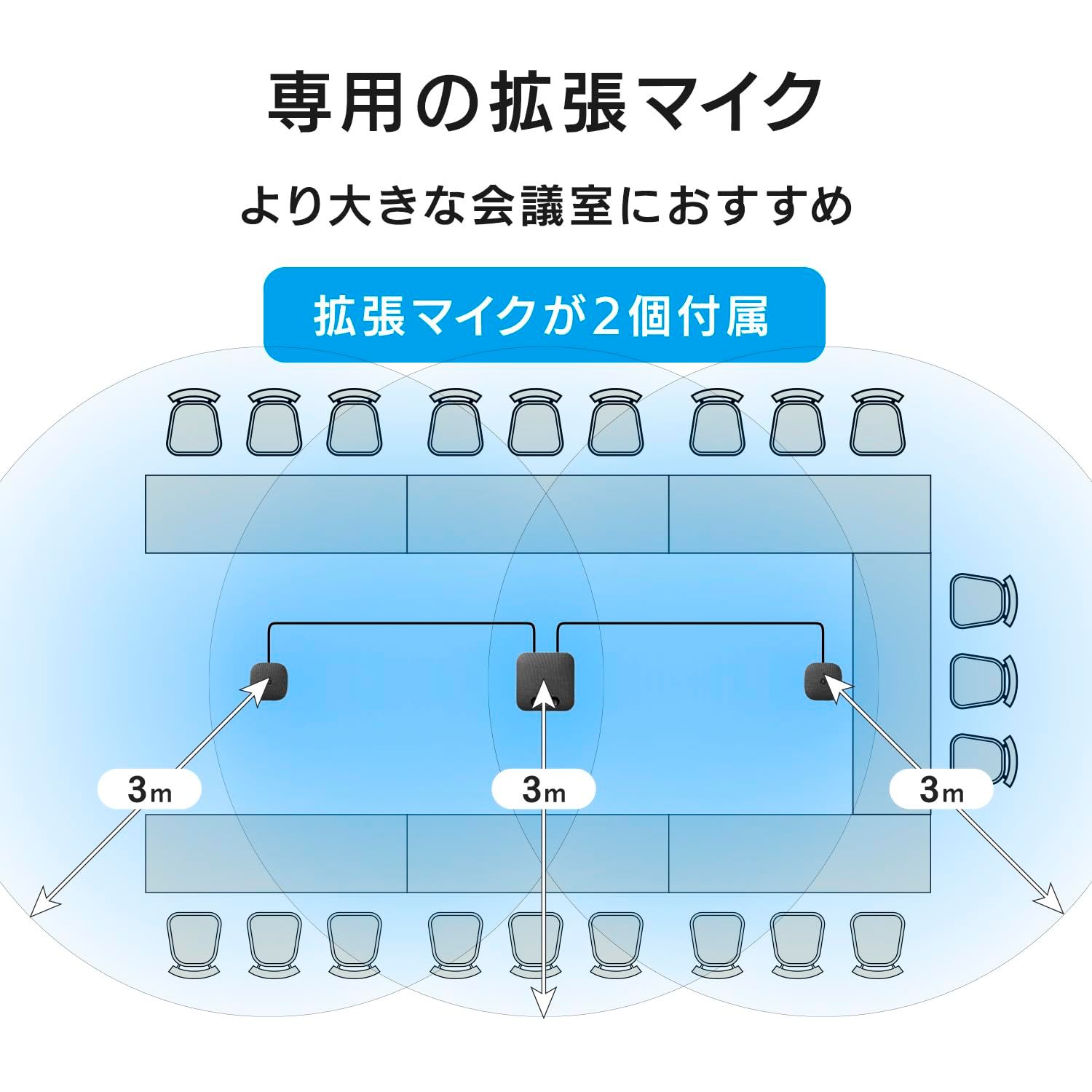 【簡単接続!マイク・スピーカーが一体になったスピーカーフォン】スピーカーと集音マイクが搭載された、ハンズフリーで通話ができるスピーカーフォンです。マイクとスピーカーが一体となっているので、これ1つで音声によるWeb会議を始められます。マイクの集音範囲は推奨3m以内、最大約5m(360°)。10~15名程度の大人数での会議に最適です。【専用の拡張マイク2個を付属!より大きな会議室におすすめ】拡張マイク2個が付属。拡張マイクを接続することで、より広い会議室での使用も可能となります。20名程度の会議にオススメです。※親機には専用拡張マイク以外のものは接続しないでください。本商品に付属の拡張マイク接続ケーブルの長さは約3mです。【さまざまな音声処理機能で、ノイズが少なくクリアな音声を実現】さまざまな音声処理機能を搭載しているため、ノイズが少なくクリアな音声を実現。ストレスフリーにWeb会議を行うことができます。【ZoomやTeamsなどの主要なWeb会議ツールに対応!】Zoom、Teams、Skypeなどの主要なWeb会議ツールに対応。これらのツールを使って簡単にWeb会議を開催できます。【Chromebook対応!遠隔授業でも活用できる】近年学校への導入が進んでいるChromebookでも使用できます。Web会議ツールと組み合わせることで、遠隔授業にもご活用いただけます。