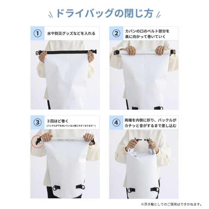 防水ドライバッグ(約φ250×600mm)×1、水に流せるポケットティッシュ・防災ガイドブック・ヘルメット・乾電池式ヘッドライト・アルカリ保存水(500ml)・ブルーシート・軍手・給水バッグ(5リットル)・絆創膏&綿棒セット・ウェットティッシュ(5年保存)・紙皿(おわん型)(10枚入)・エアークッション・静音アルミブランケット・使い捨てカイロ・7年保存クッキー・ゴミ袋半透明45リットル(10枚入)×各1、携帯トイレ(1回分)・使い捨てマスク×各2、完封割箸×3