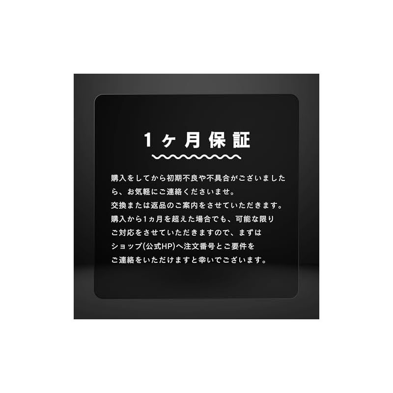 ?本製品には安心の「1ヶ月」が付いております。万が一、初期不良や不具合などがございましたら、お受け取りから30日以内にご連絡ください。なお、期間を過ぎた場合でも、状況に応じて柔軟に対応させていただきますので、お困りの際は遠慮なくお問い合わせください。お客様に安心してご使用いただけるよう、誠意をもってサポートいたします。