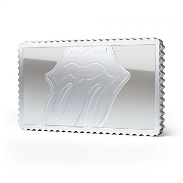 切手のデザインはフルカラーで印刷され、裏面にはローリング・ストーンズの象徴である舌と唇のロゴがプルーフ仕上げで打たれ、銀の含有量を確認するためのホールマークが施されています。