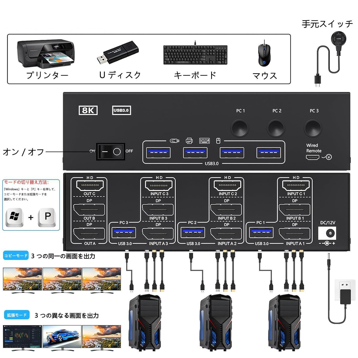 Switch PC 3台とディスプレイ3台対応 KVM USB 3.0ポート キーボード マウスを3 PCで共有 8 K 30 Hz 4 144 DPポート ドライバー不要 HDMI 3モニター コピー 拡張モード 簡単に接続 3 KVM切