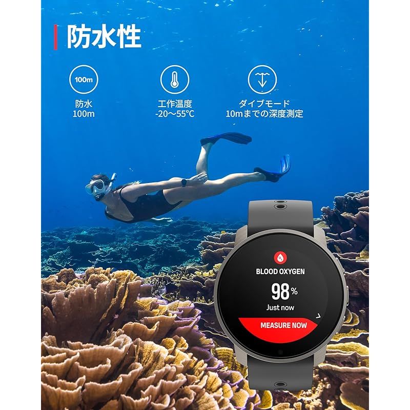 主な機能:血中酸素レベル計測、睡眠計測、消費カロリー計測・歩数計(アプリと連動)、心拍・速度・距離・方角・高度計測、時計上にアウトドアマップとヒートマップを表示、スマートフォン着信通知、調整式バックライト、1時間でフル充電完了、防水: 100m 、水深最大 10m まで測定、 軍規格適合試験済み(MIL-STD-810H)、バッテリー駆動時間:GPSモード(40時間/70時間/300時間)、日常的な使用で21日間、衛星システム(GPS, GLONASS, GALILEO, QZSS, BEIDOU)