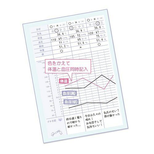 詳細情報見開き1週間の折れ線グラフで変化がでわかりやすい、体温・血圧・体重などが記録できる管理ノートです。