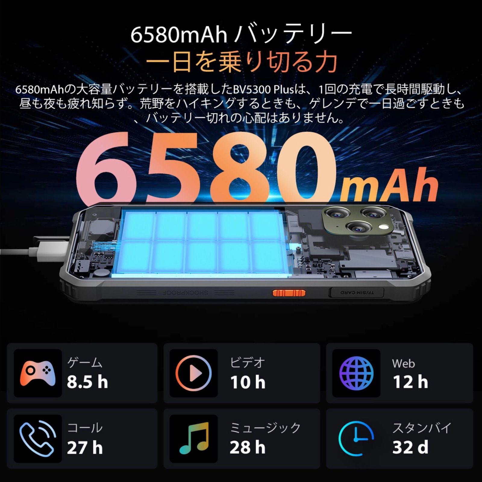 【6580mAhバッテリー、一日中電力供給】6580mAhの大容量バッテリーを搭載したBV5300 Plusは、単一の充電で長時間動作し、一日中お使いいただけます。