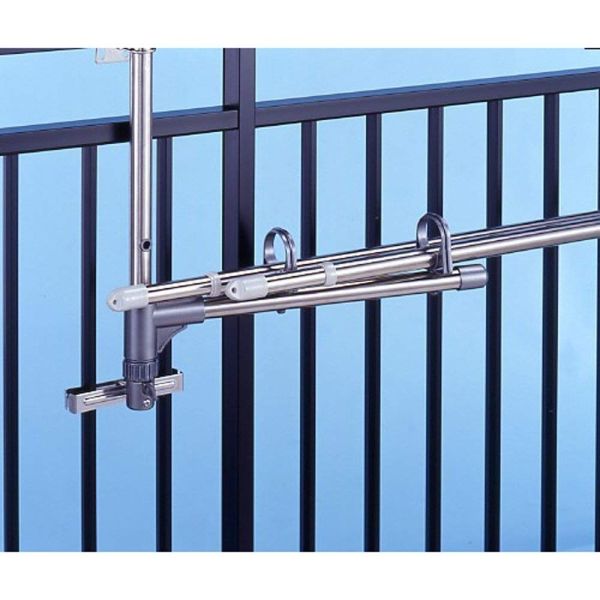 取付範囲:丸手すり Φ50~100㎜まで、角手すり W50~100XD100XH30㎜ 下段は竿を掛けたまま収納可能 格子手すりへしっかり取り付け可能。 物干し竿はつきません。 ベランダの手すりに物干し竿を掛けられる ベランダの手すりに物干し竿を4本掛けられる物干し金具セット。、 格子状の手すりにしっかりと固定出来ます。太さ5~10cmまでの手すり(角パイプ・丸パイプ)に取付可能。 壁面になっている手すりには取付けできません。 本体はサビに強い高級感のあるステンレスパイプを使用。 一般用の直径3cmまでの物干し竿を上段2本、下段2本の計4本掛けられます。 下段の竿受け部分は竿を掛けたまま回転し、手すり側に倒してスッキリ収納できます。 かけられる重さ:全体で30kgまで かけられる竿の太さ:直径3cmまで 1個あたりの使用時サイズ(約):幅6×奥行65×高さ107cm 材質:パイプ/ステンレスパイプ 部品/ポリプロピレン、ABS樹脂、鉄 中国製