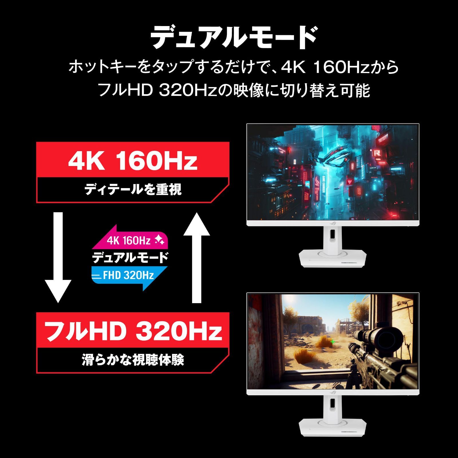 ROG Strix XG27UCG-W デュアルモードゲーミングモニター 白 - 27インチ/4K (3840x2160)/デュアルモード(4K 160Hz フルHD 320Hz)/1ms (GTG)/Fast IPS/USB Type-C/高さ調整可/VESA対応 (100x100mm)/HDR対応/三脚ソケット付き/スマホホルダー付き/Aura Sync対応/国内正規品