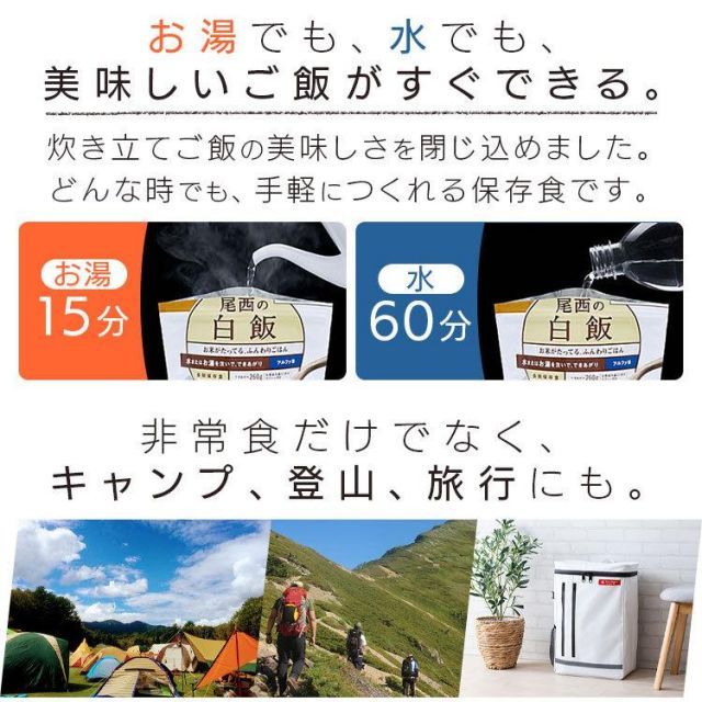 お湯又は水さえあれば、簡単にふっくらご飯ができあがります。