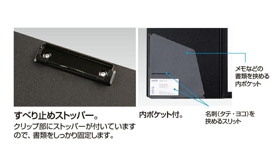 ●すべり止めストッパー付のクリップが書類をしっかり固定します。