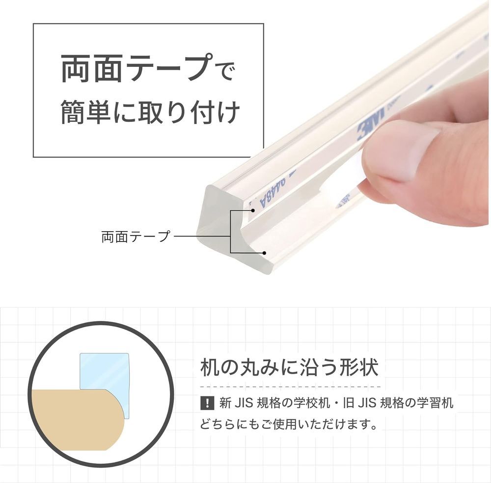 ○学校机の角Rに対応。新JIS、旧JIS規格の学校机にもご使用頂けます。長辺なら2本まで、短辺なら1本設置可能。ハサミでカットもできます。