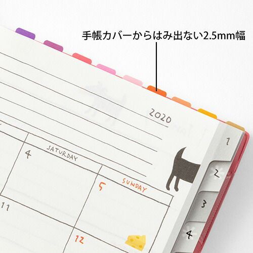 詳細情報手帳をきれいにまとめる!チラッと見えるインデックス。ページの端に貼ったときの飛び出しをカバー付き手帳の内側に収まる2.5mmにすることで、インデックスを傷めることなくきれいに使うことができます。