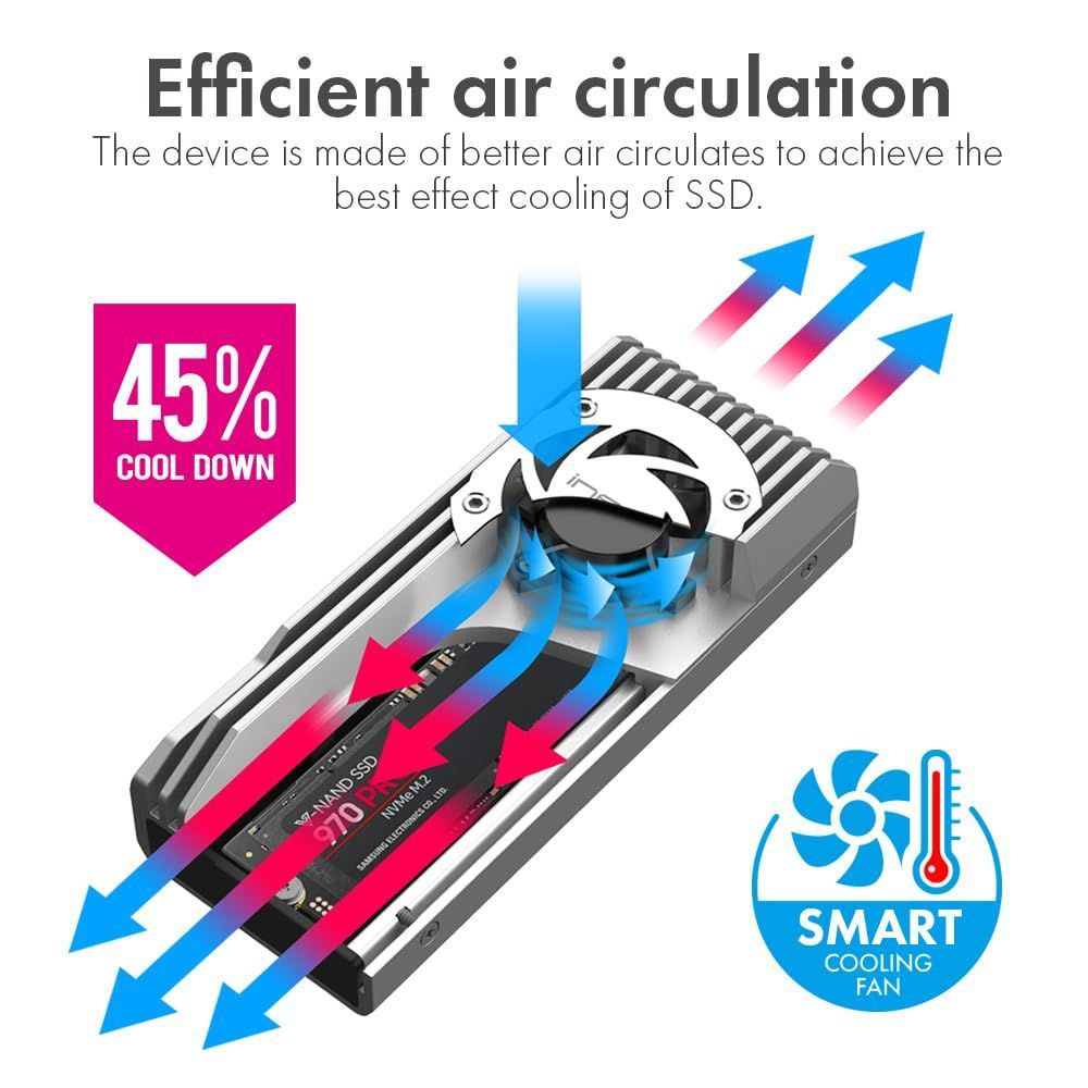 アルミニウム製のシェル、もっと良くSSDを保護して、放熱もよくされます。それに、内蔵スマートサイレントファンを加えて、放熱がもっとよくなります。内蔵サイレントファンは3.3V 6000 RPM。
