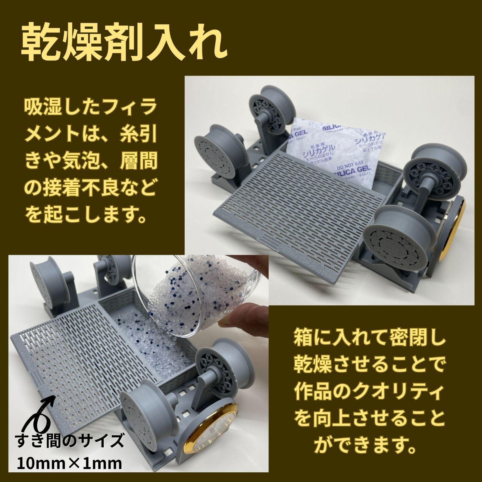 吸湿したフィラメントは、糸引きや気泡、層間の接着不良などを起こします。箱に入れて密閉し乾燥させることで作品のクオリティを向上させることができます。