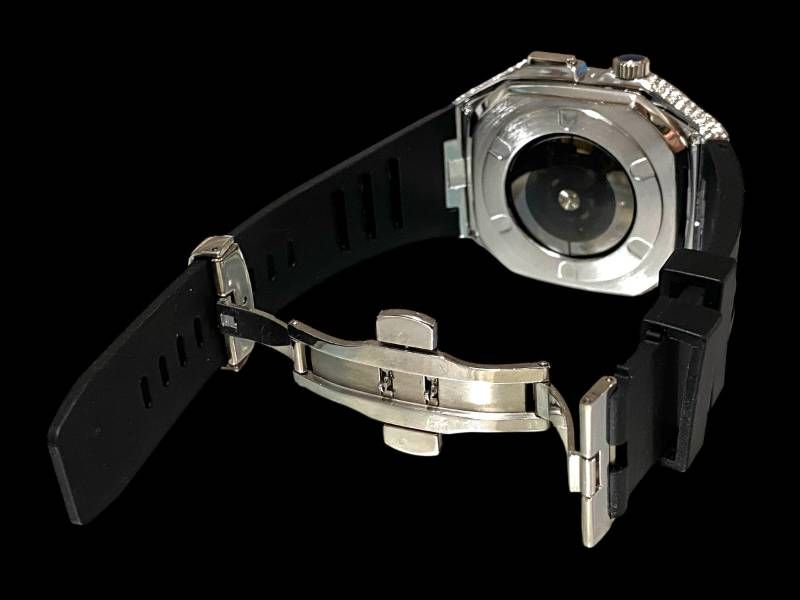 高精度にセットされたCZダイヤが、ケース全体を包み込むように煌めき、