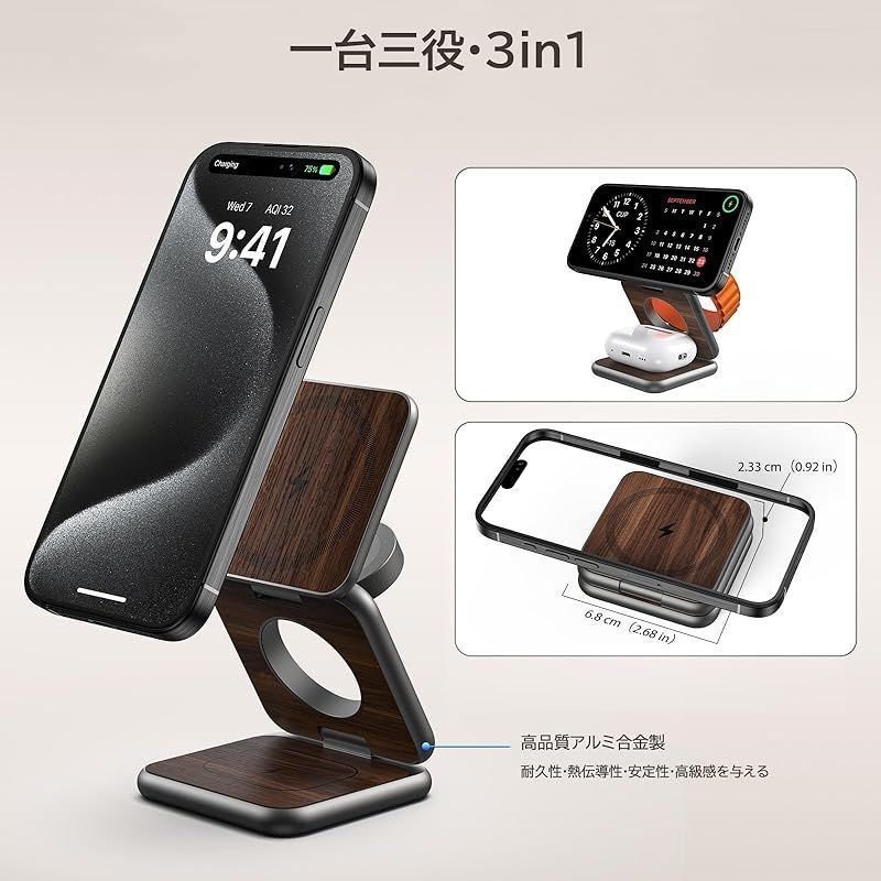 【美しさと耐久性を両立】この3in1 充電器はアルミニウム合金製で、高級感があり、耐久性と放熱性に優れています。表面に木目模様が施されたワイヤレス充電器は、傷や汚れが目立ちにくい特徴があり、自然の美しさとアルミ製の高い耐久性を持っています。また、ベースは厚めに設計され、シリコン付きの滑り止め加工により、携帯の転倒を防ぎます。