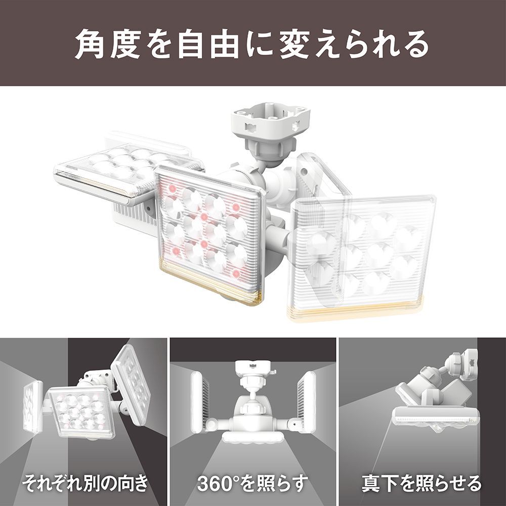 商品名:光と音の防犯! フレキシブル設置&リモコン操作の高機能センサーライトで、家も心も安心。 3灯タイプです。