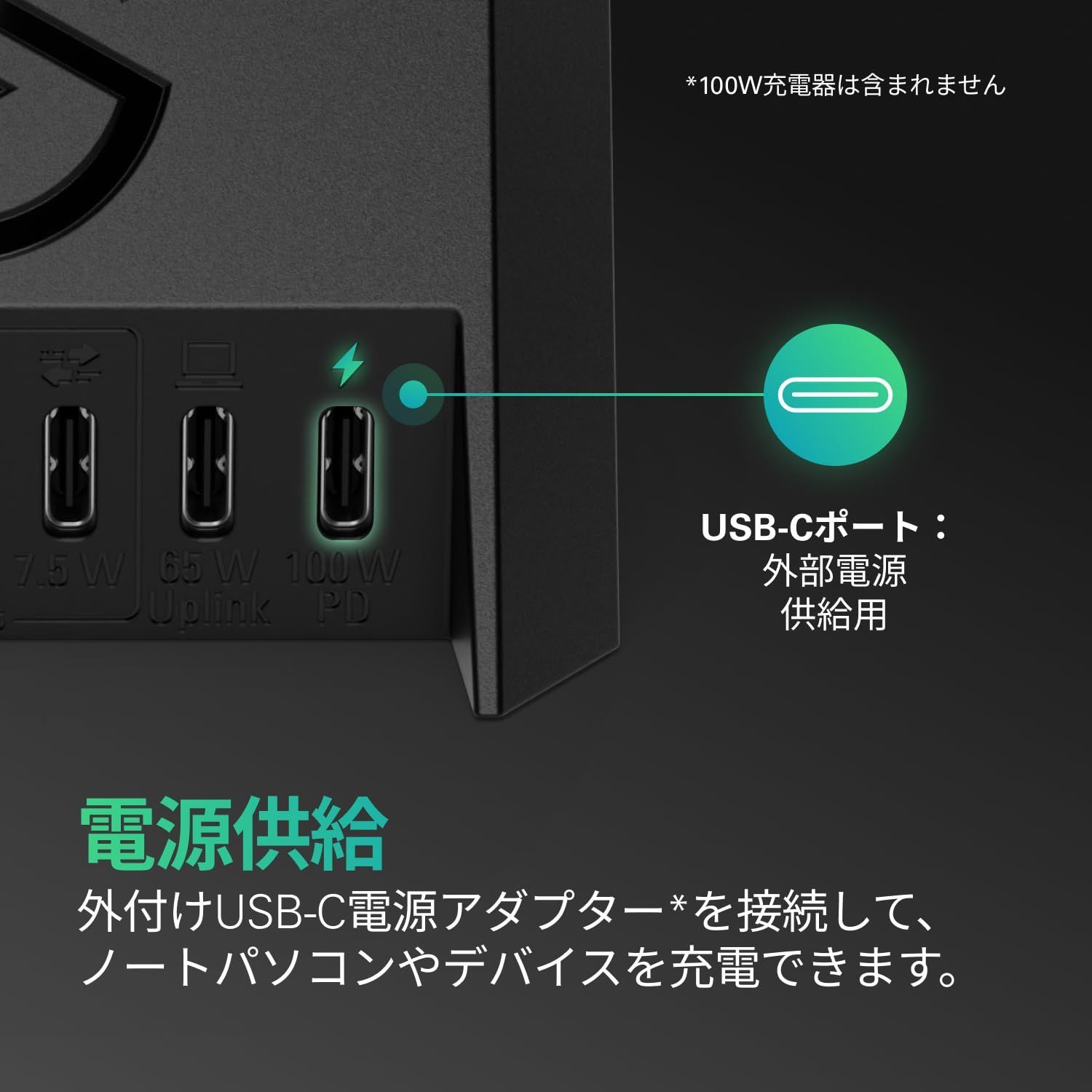 USB PD対応USB-C端子を備えており、入力最大100W、出力最大65Wの充電機能を利用可能です(PD対応ACアダプターは別売です)。
