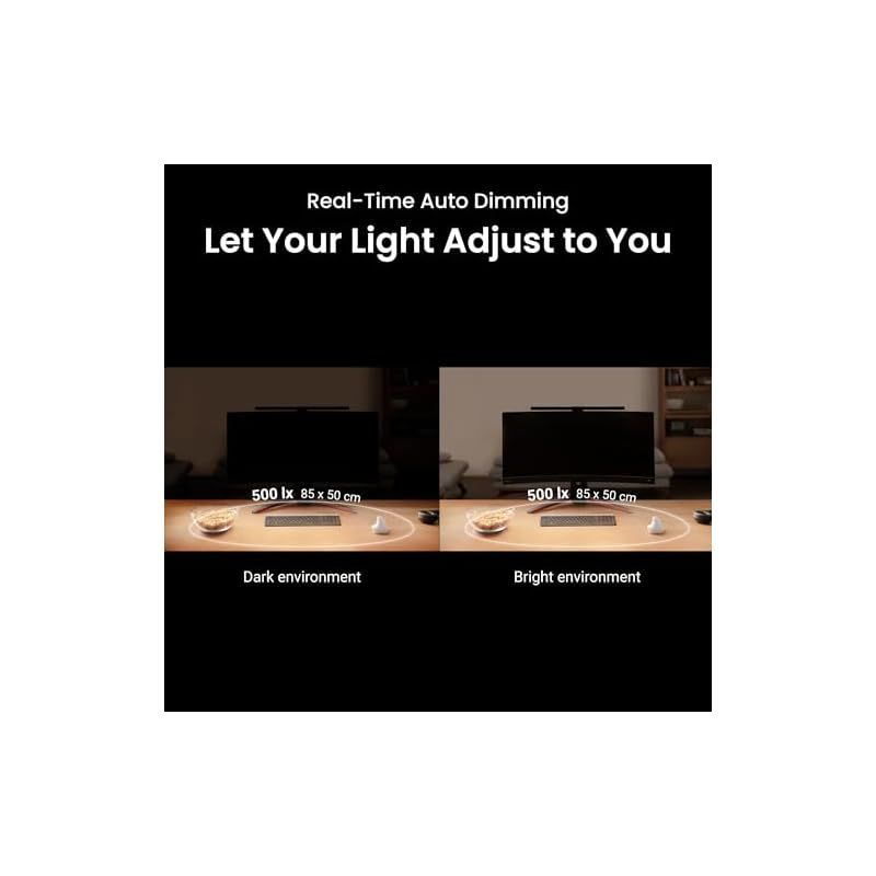 広範囲照明:ScreenBar Pro の中央照度が1000ルクス以上で、85*50cmの範囲で500ルクスの照度を提供し、ほとんどのPC作業環境において目に優しい快適な照明を提供します。