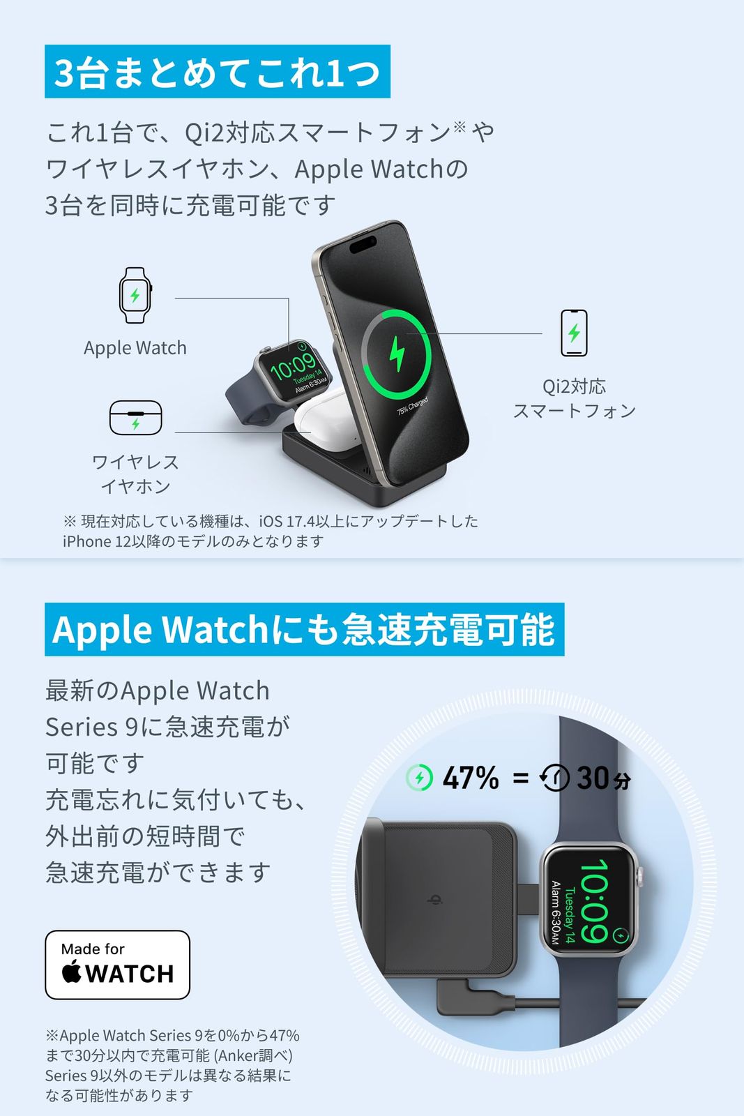 Apple Watchにも急速充電可能:最新のApple Watch Series 9に急速充電が可能です。充電忘れに気付いていても、外出前の短時間で急速充電ができます。