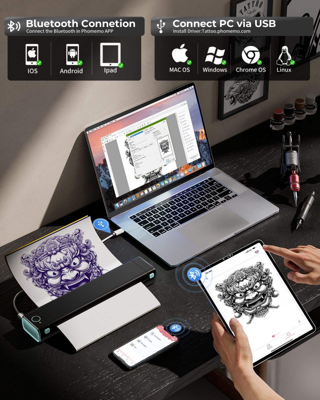 【オールインワンプリンタ】テンプレートプリンタはIOSとAndroid携帯電話のBluetooth接続に対応し、Windows、MacOS、ChromeOSのUSB接続に対応している。Itariタトゥーテンプレートプリンタでは、通常の感熱紙を印刷することもできます。多種のファイルフォーマットをサポートする:Word、Excel、PPT、TXT、JPG。1台のプリンタ、複数の用途