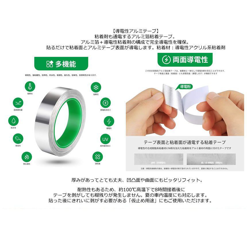 粘着剤も通電するアルミ箔粘着テープ。アルミ箔+導電性粘着剤の構成で完全導電性を確保。貼るだけで粘着面とアルミテープ表面が導電します。粘着材:導電性アクリル系粘着剤。