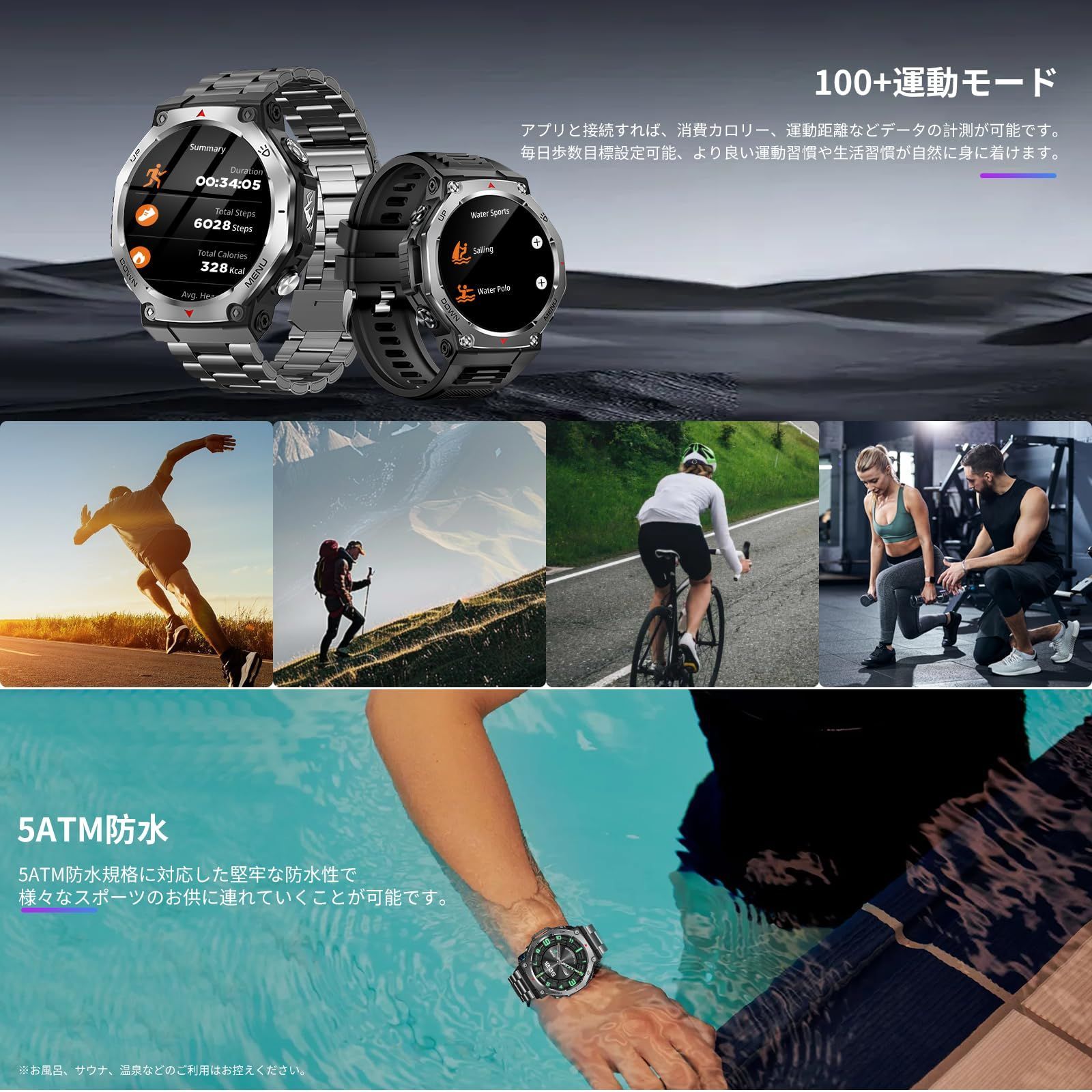 【1.43インチAMOLEDタッチディスプレイ&軍用規格スマートウォッチ】 このスマートウォッチは高精細で美しい色を表現できる1.43インチAMOLEDタッチディスプレイを搭載し、視認性に優れた466*466高解像度大画面を採用され、画質がより鮮明になり、より高精度な大画面で文字を表示されます。例のない快適な視覚感と優れた操作感をもたらします。 更に、このスポーツウォッチは軍用級の材料を採用され、高温・低温・衝撃・防塵防水などの軍事規格認証をクリアして、あらゆる過酷な条件や試練にも耐えることができて、最も信頼できる仲間であります。※お風呂、サウナ、海水、温泉などのご利用はお控えください。