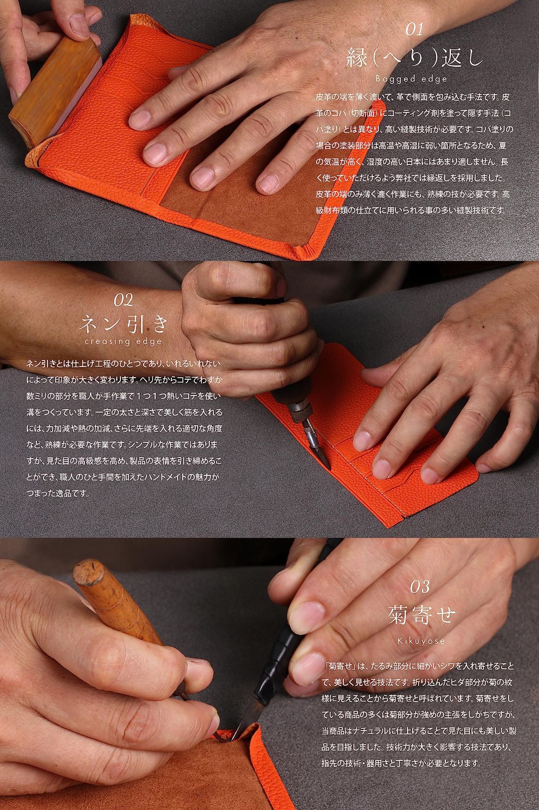熟練の職人がハンドメイドで丁寧に全工程を仕上げた珠玉の一品。効率の良さではなく品質の高さを追求した、強く美しいアイテムです。