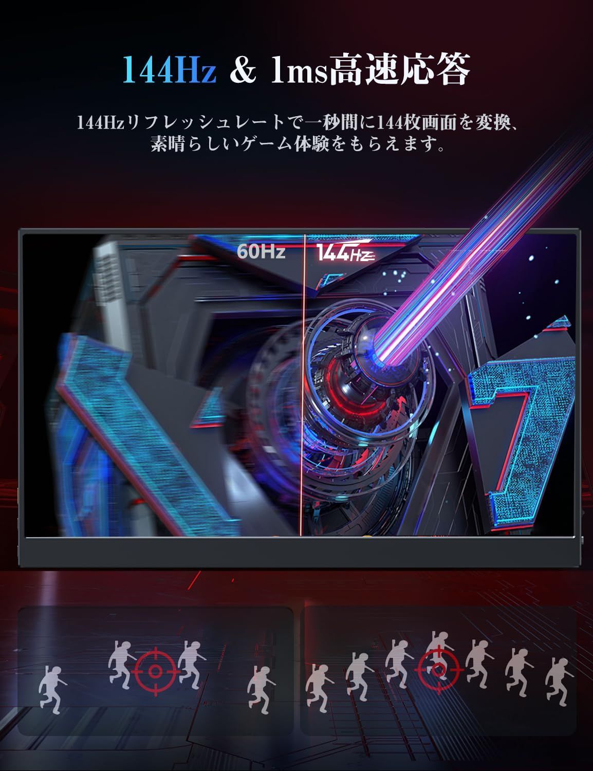 【144Hz高速応答・FreeSync対応・ゲームに最適!】このゲーミングモニターは従来の60Hzディスプレイと比較して、144Hzのリフレッシュレートはより滑らかで繊細なダイナミック効果を提供でき、色はより鮮やかでリアルで、コントラストと黒のレンダリングも優れています。FreeSyncも対応しているので、画像のテアリングを回避できて、画面がよりスムーズになり、ゲームをするのに最適。驚くほど滑らかなゲーミングビジュアルと16.1インチ大画面を合わせて、ゲームの遅れなくスムーズに移動することができて迫力も倍増!