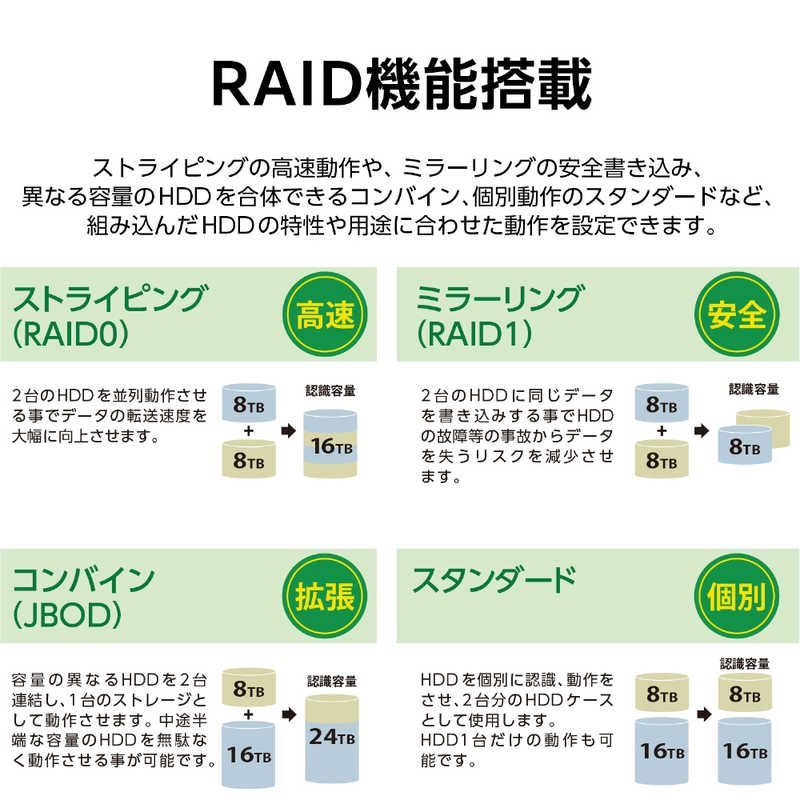 詳細RAID機能:ストライピング(RAID0)、ミラーリング(RAID1)、コンバイン(JBOD)、スタンダード