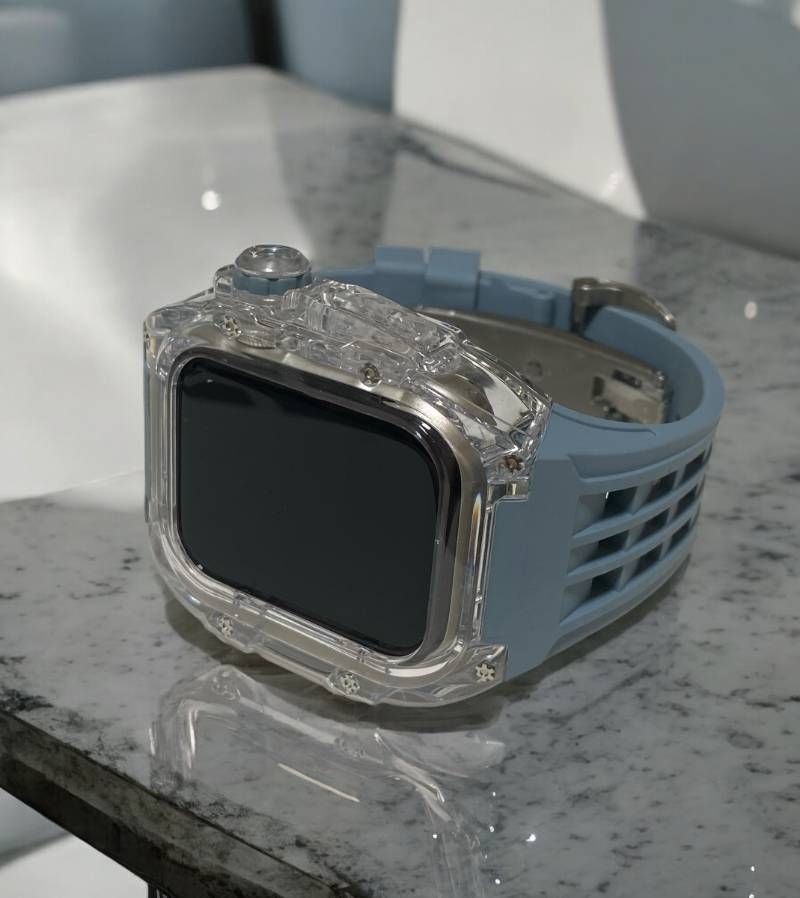 透明感のあるポリカーボネート製スケルトンカバーと、上質なフッ素ラバーベルトを組み合わせたApple Watch用セット。