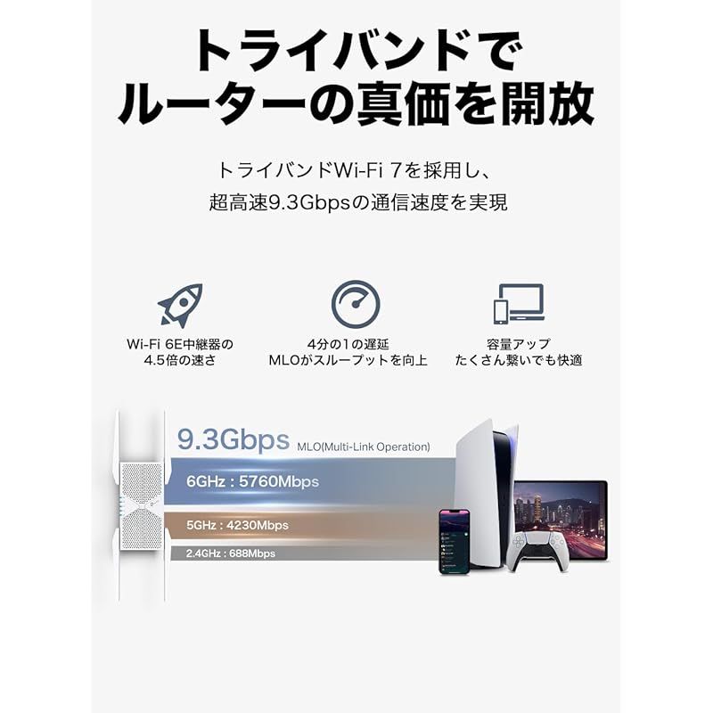 超高速9.3Gbps トライバンドWi-Fi: 5760Mbps(6GHz)・2880Mbps(5GHz)・688Mbps(2.4GHz)の専用バンドを備え、混雑や干渉の少ない高速でシームレスな接続を実現します。