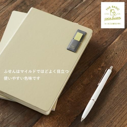 "『ココフセンベーシック』は、ケース裏面の粘着で本や手帳にケースごと貼り付けて、「ふせんを使いたいとき、いつもそばにある」状態をつくる、携帯性に優れたフィルムふせんです。大きさ・厚みとも最小限に抑えたコンパクトなケースにふせんを内蔵していて、ふせんを使い切ってしまったあとは専用ふせんリフィルを詰め替えてケース本体はくり返し使用可能です。金の箔押し入りで上質感のあるケースと、シンプルで使いやすい色味のフィルムふせんが暮らしに溶け込み、""いつもそばで""活躍します。"