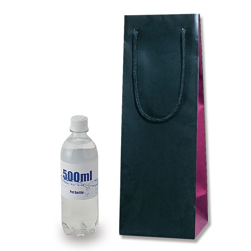 正面と側面を2色で彩りました。箱入りワインや一升瓶等も入る、ちょっと大きめの規格です。手紐:ポリエステル表面マットPP貼り口ボール・底ボール付