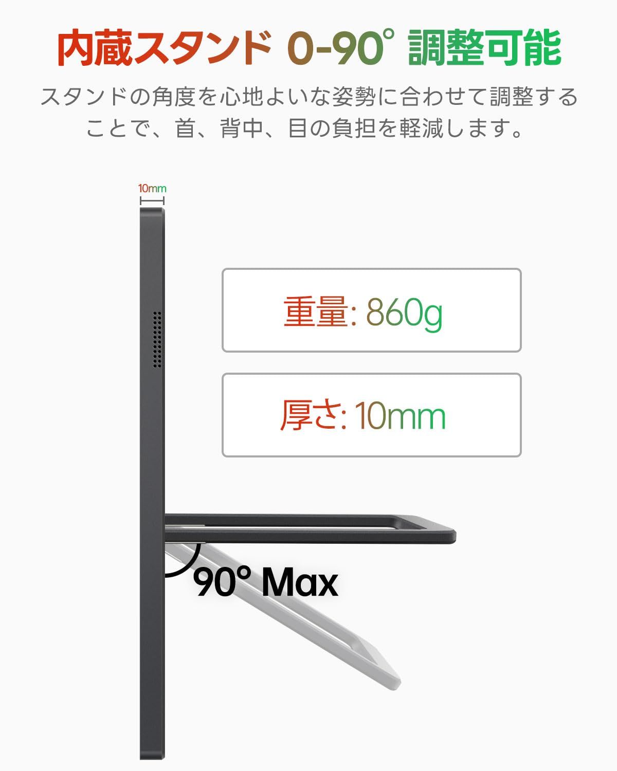 【スタンド内蔵&VESA対応】本体に安定性の高い自立スタンドを内蔵しており、角度調整も自由自在。机の上でもソファの上でも、好みの姿勢で使用可能です。また、VESAマウント(75×75mm)にも対応しており、モニターアームでの固定設置にも対応。さらに、アルミ合金ボディを採用し、高級感と放熱性を両立。日常使いにも安心のタフなタッチモニターです。