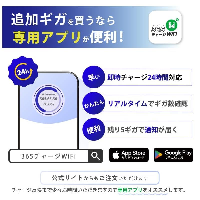 365チャージWiFiはプリペイド型のチャージWi-Fiです。ギガを使い切った後の追加チャージも最安値に挑戦中!!※4G回線対応5G回線未対応