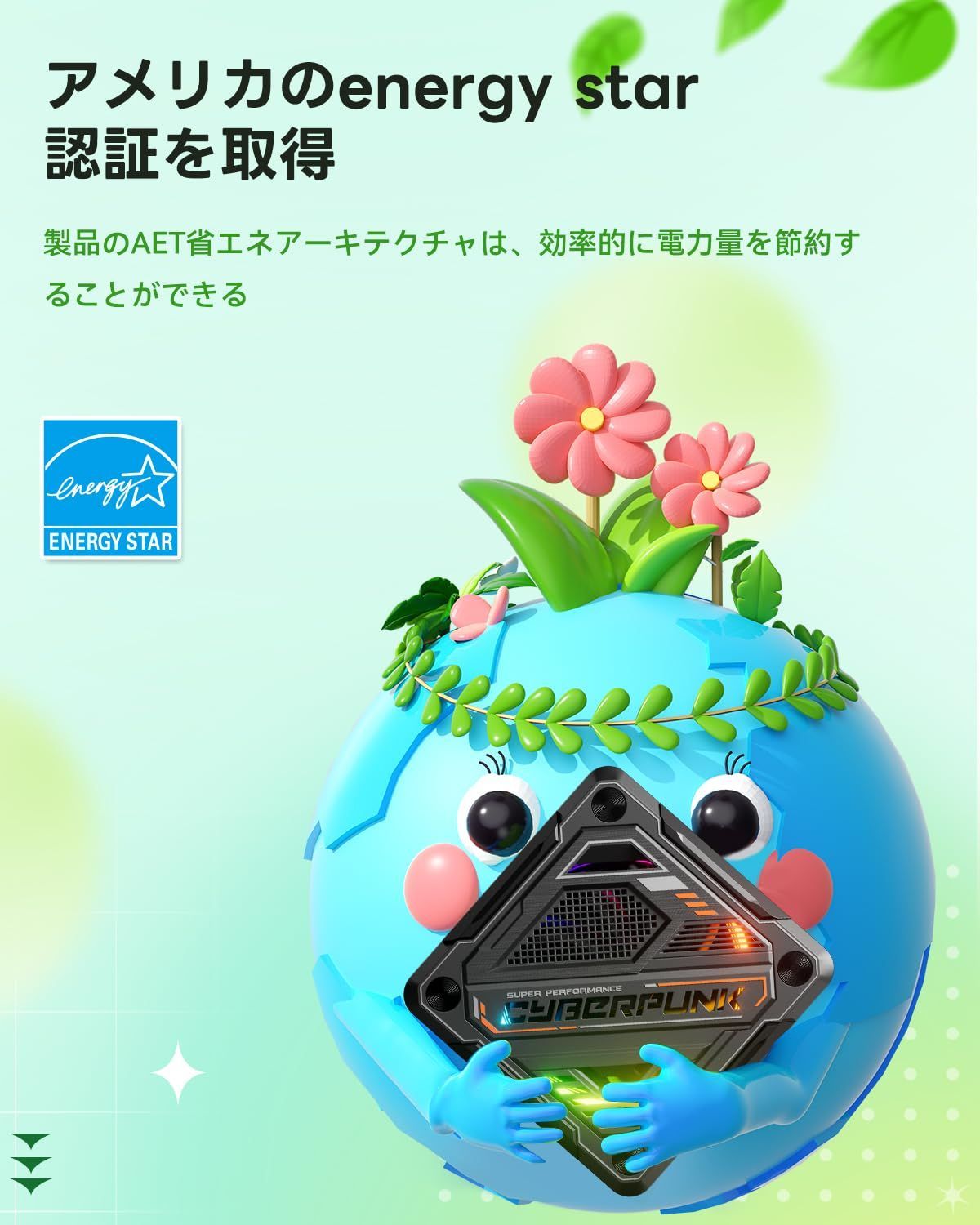 【省エネ設計】当社のブランドのMini PCは、VAT(節電)アーキテクチャを採用しており、CPU消費電力は15W(デフォルト)、全体の消費電力はわずか35Wです。デフォルトの待機時は20Wから28Wで、通常のアーキテクチャのミニPCと比較して、電力消費を5%から20%削減できます。