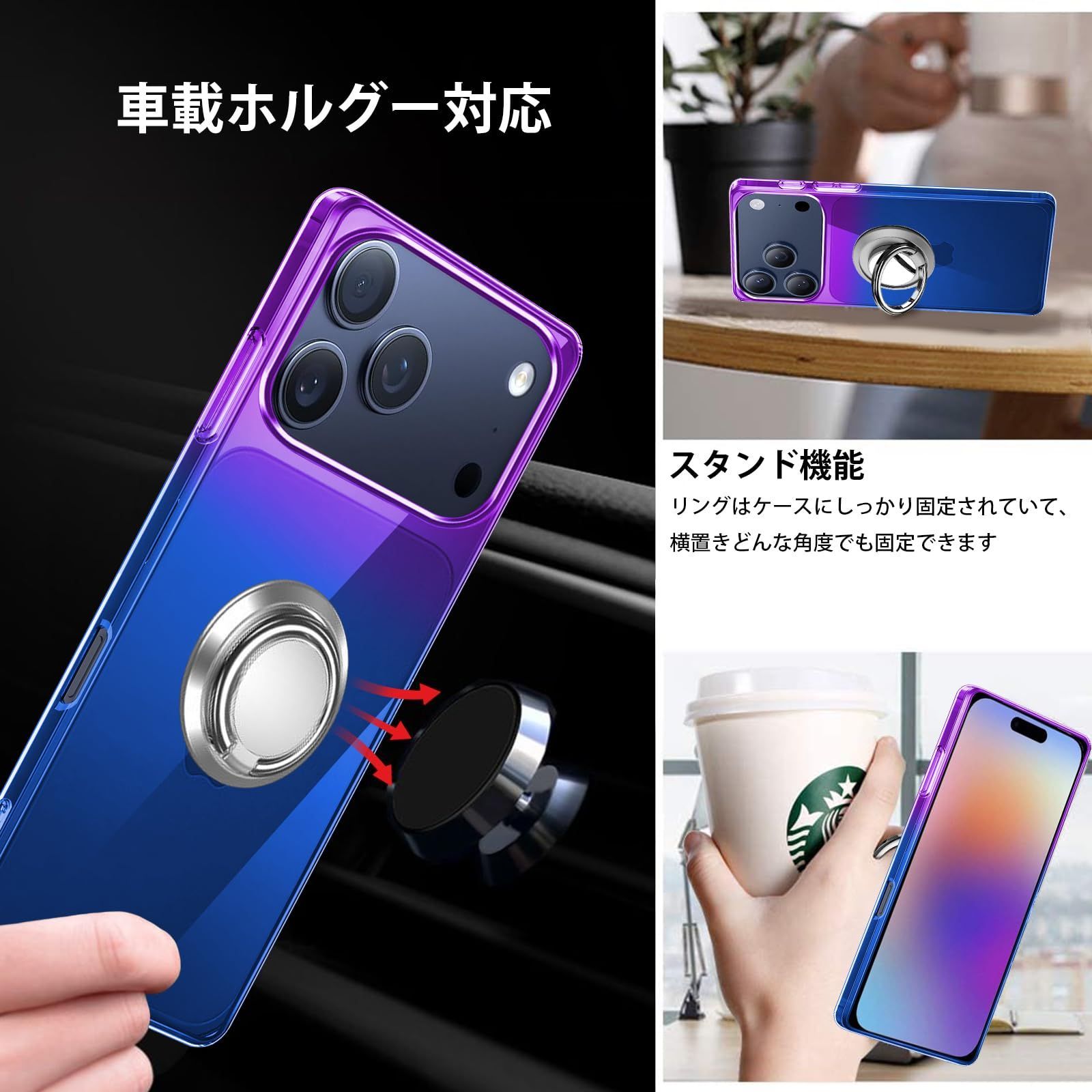 商品 一体型 防塵 車載ホルダー対応 指紋防止 耐衝撃 携帯カバー カバー 用 17 Pro ケース 全面保護カバー グラデーション色 シリコン 軽量 薄型 パープルブルー TPU リング iPhone