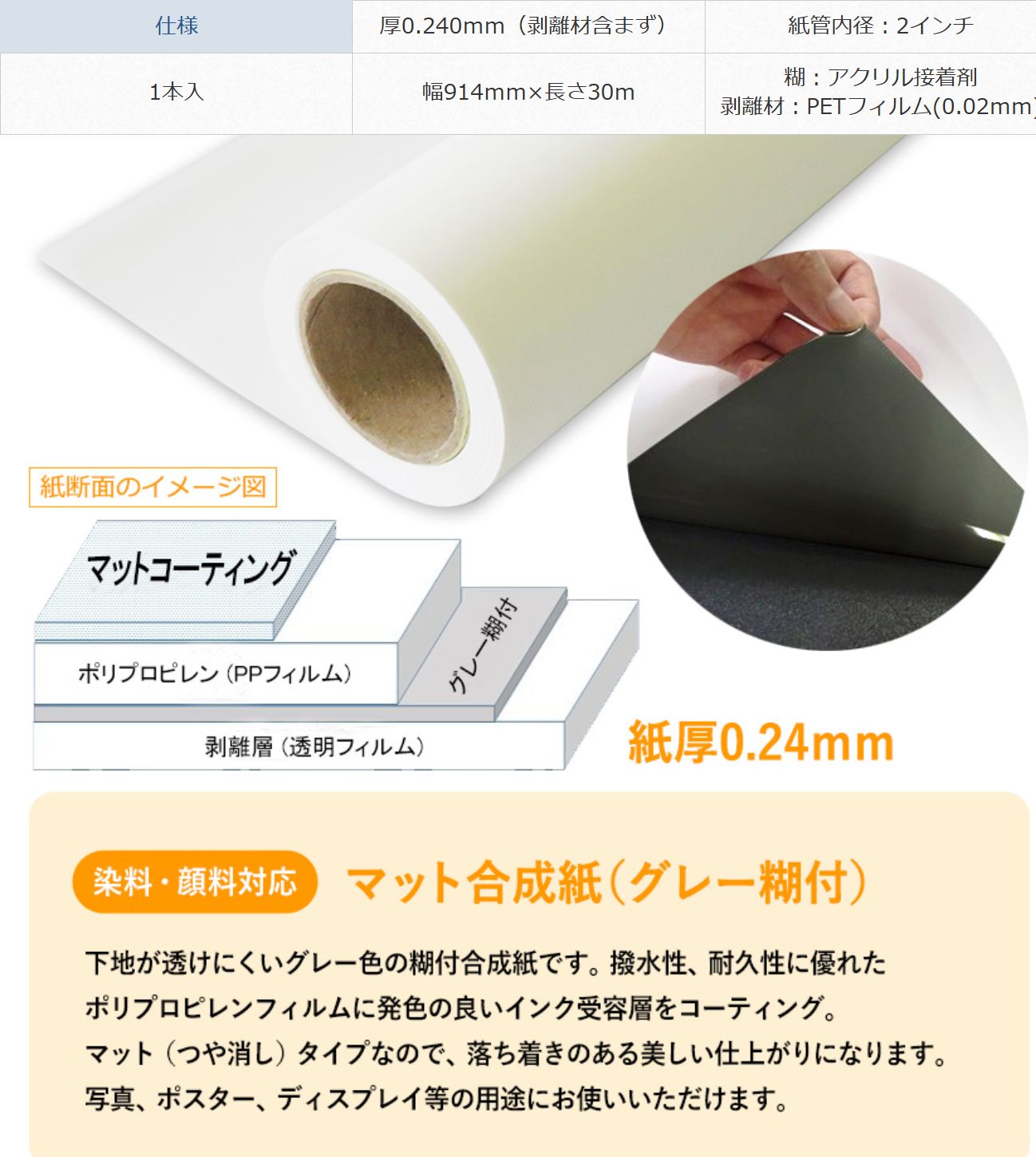 ポスター用紙 インクジェットロール紙 マット合成紙 グレー糊付 914 mm×29 M 1本 A 0ノビロール