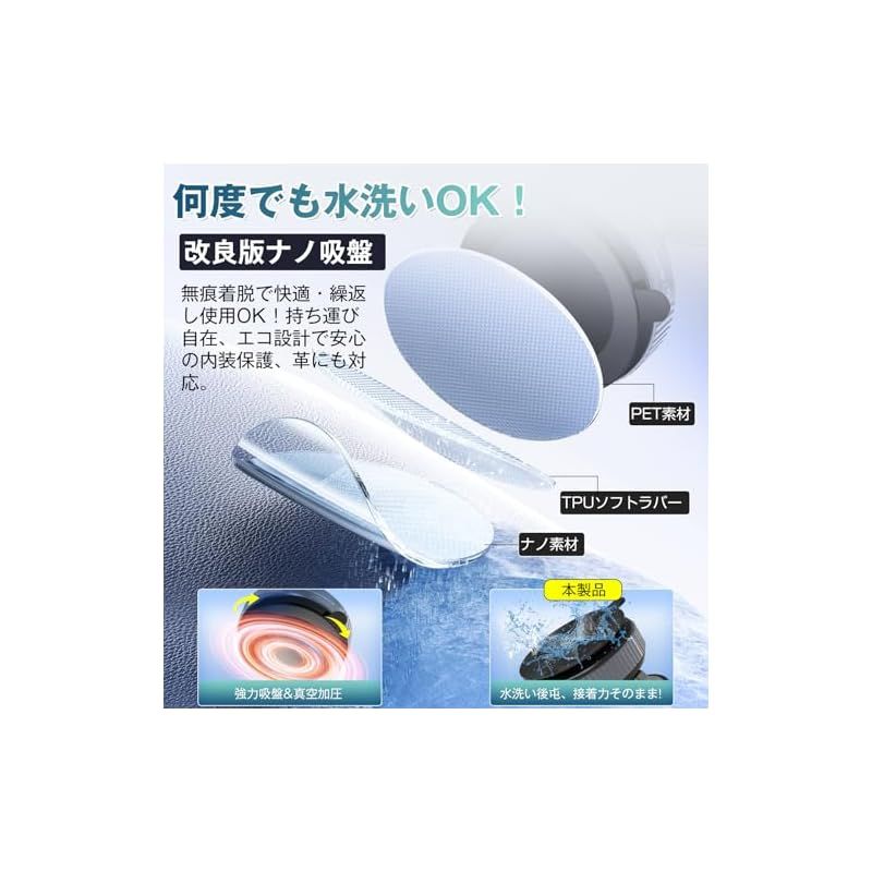 【水洗いで粘着力復活、繰り返し使用可能】吸盤の粘着力がすぐ落ちて困ったことはありませんか?ナノ真空吸盤は取り外して水洗いするだけで粘着力が復活。粗めの平面でも強力に吸着し、跡も残らず繰り返し使用可能。ダッシュボード、側面ガラス、革シート、家庭用デスクなどあらゆる場所でスマホを自由に固定でき、従来の吸盤の“一度使ったら粘着力低下”問題を解決した万能スマホホルダー車です。