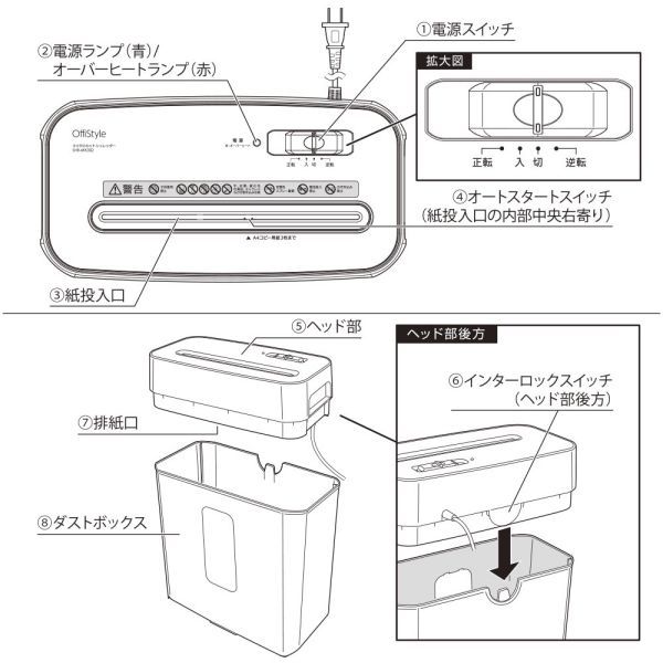 ■梱包内容:シュレッダー本体(ダストボックス含む)、保証書付取扱説明書※測定条件:室温20~25℃、相対湿度45~55%、A4コピー用紙(64g/m2)使用